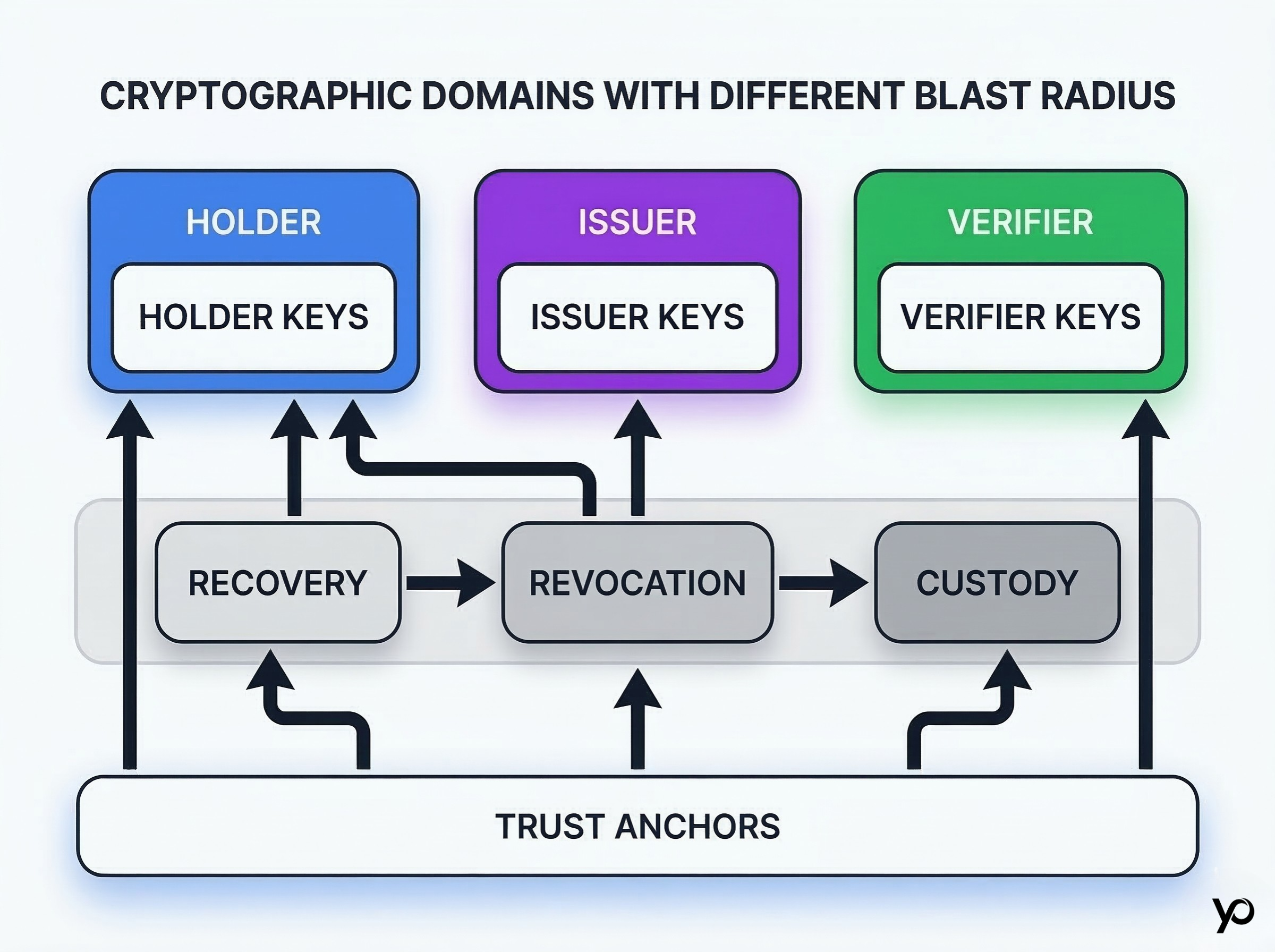 Holder keys, issuer keys, verifier keys. Identity architectures have multiple cryptographic domains, each with a different blast radius. Holders prove authority over data, issuers sign verifiable attestations, and verifiers authenticate requests. Each domain requires distinct handling.