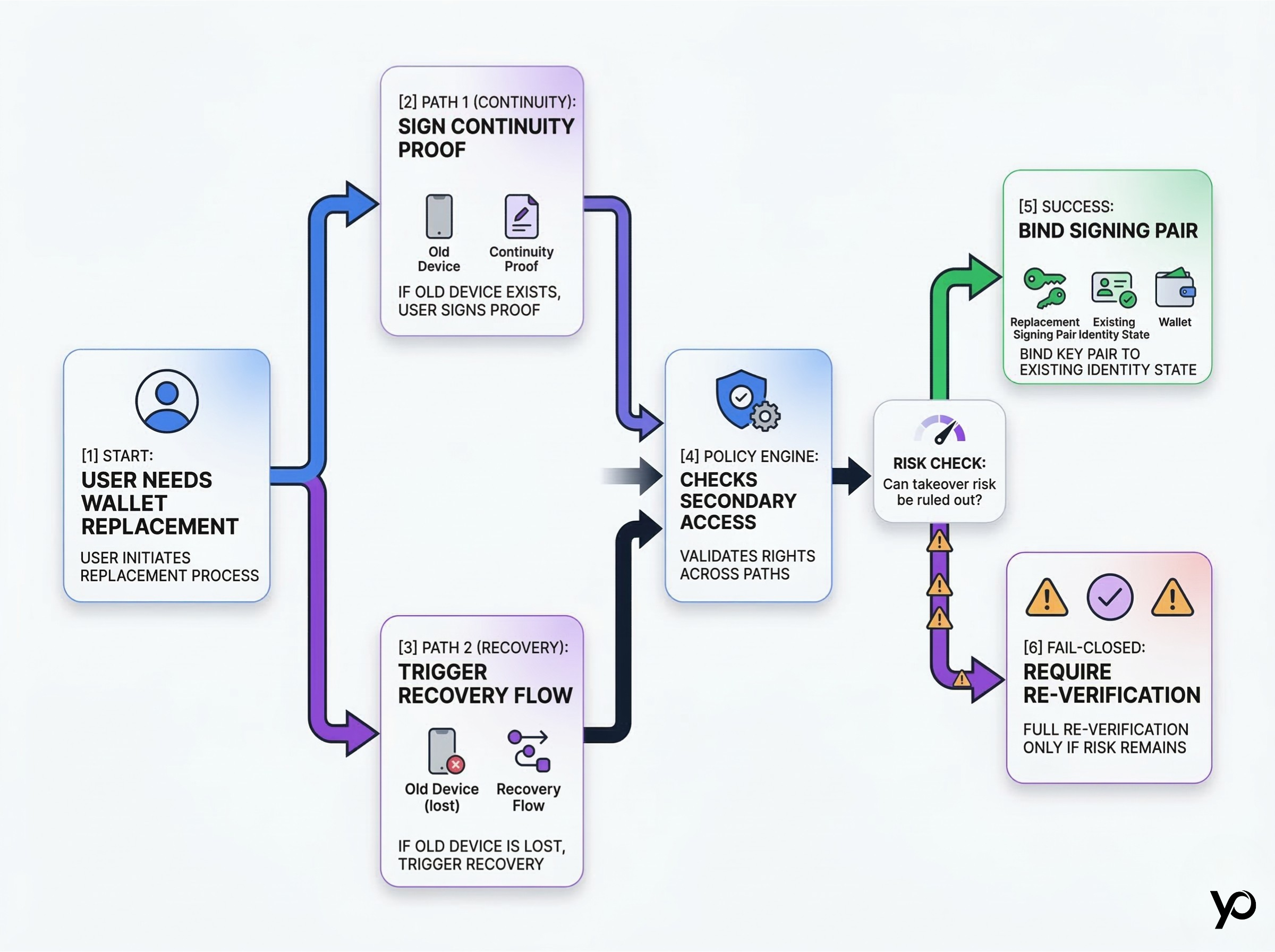 When a full re-verification is actually necessary. Continuity should be the default, but full re-KYC is required if there is evidence of malicious account takeover. The network must fail closed when continuity cannot be cryptographically proven.