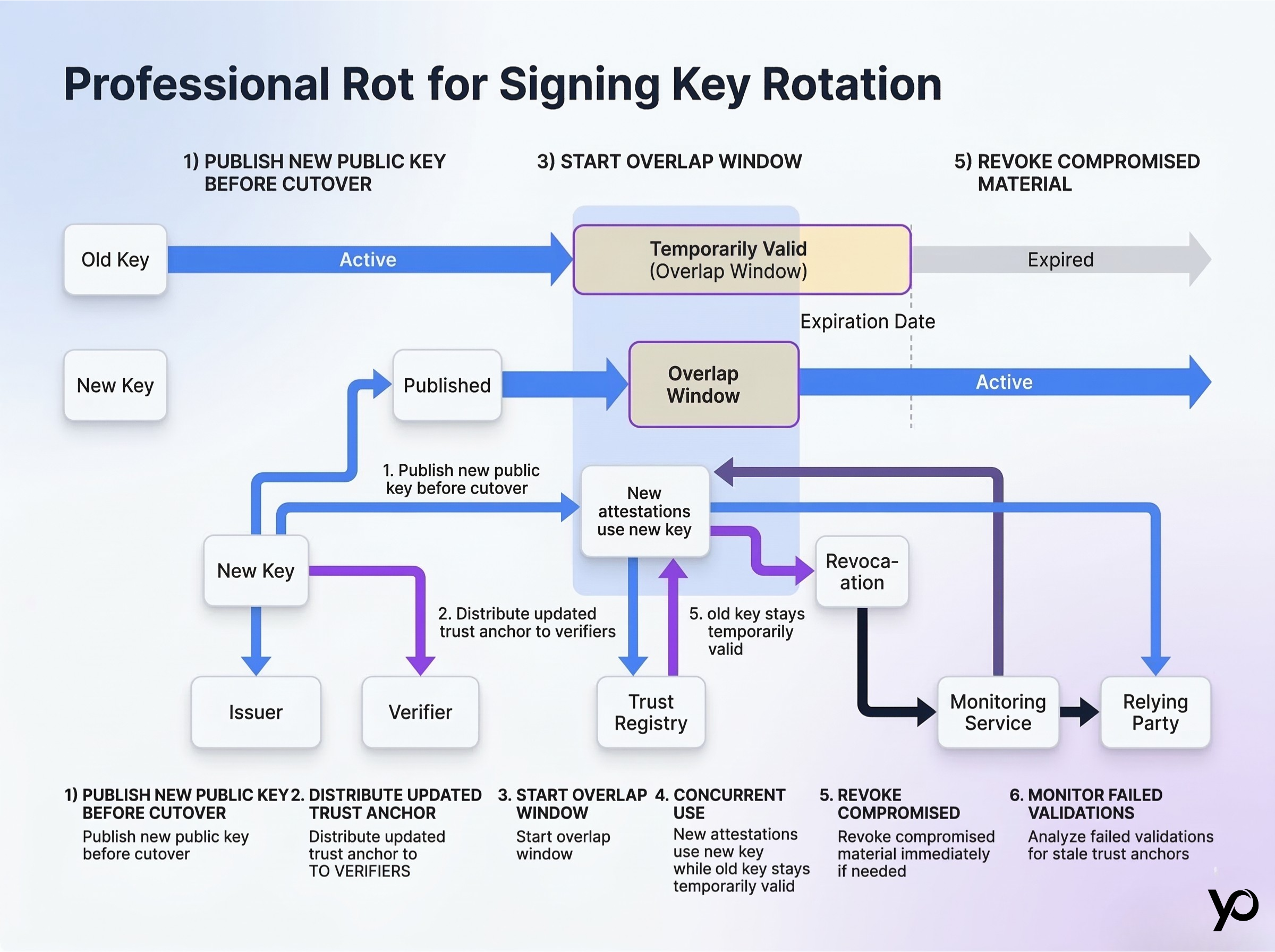 Overlap windows, expiration date, and revocation coordination. Safe transitions require an overlap schedule. The old key remains valid up to its hard expiration date, while the new key handles newly issued attestations. Under these circumstances, revocation coordination ensures compromised secrets are killed immediately. Never delete the old key until the overlap schedule concludes.