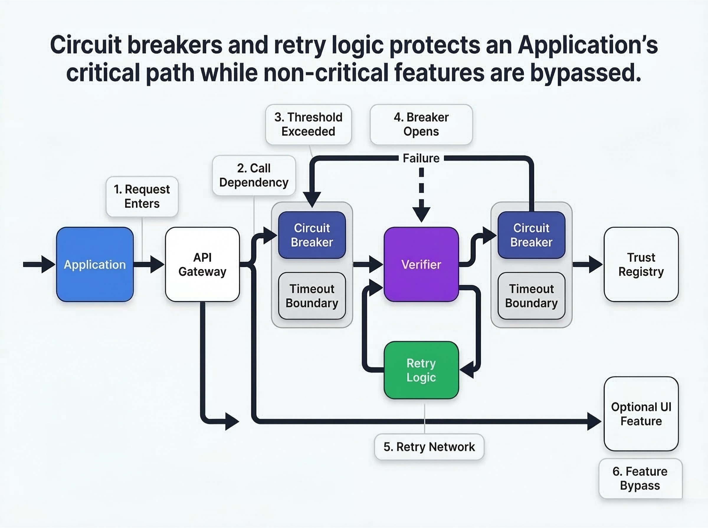 How to define circuit breaker thresholds. Implement circuit breakers between your application and the verifier, and between the verifier and the trust registry. If error rates exceed a defined threshold (e.g., 5% over 10 seconds), the circuit breaker opens, halting requests to the failing service.