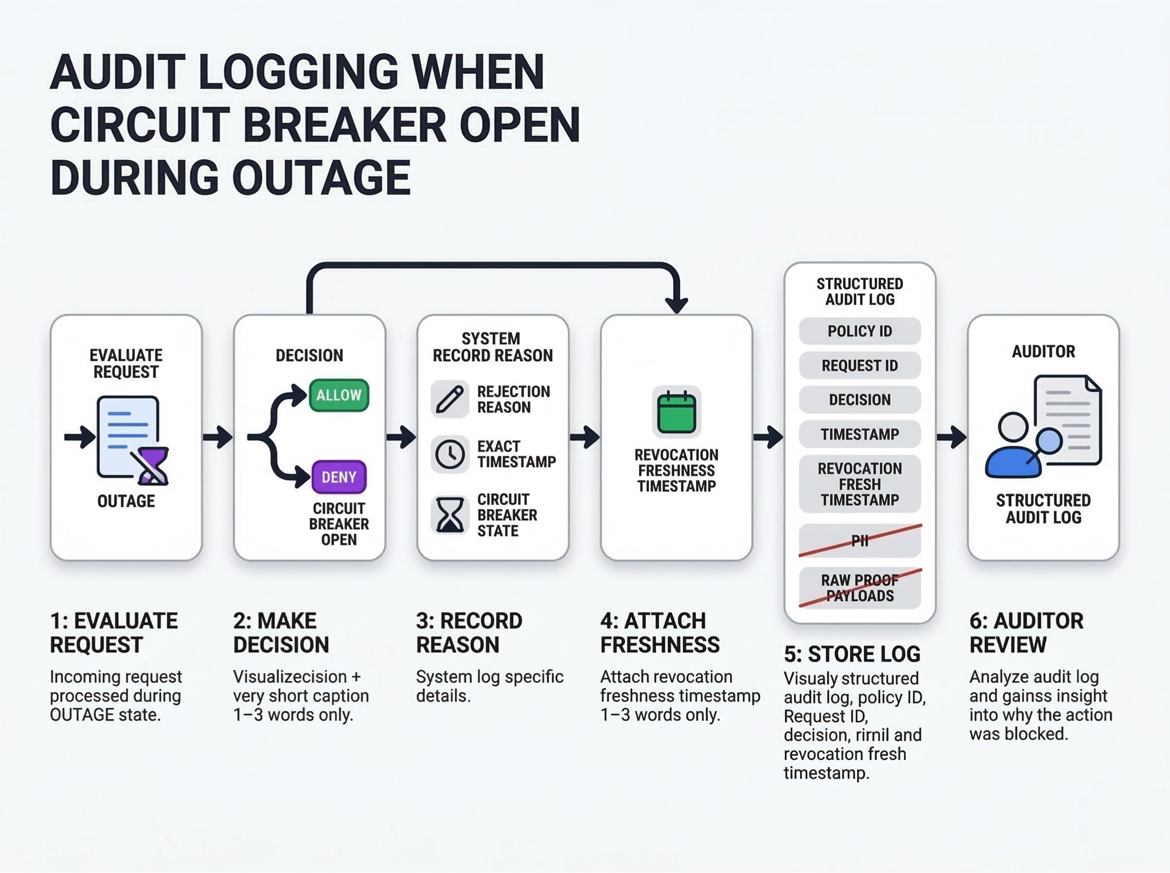 How to create evidence packs when parts of the system are unavailable. Log the policy ID, the request ID, the decision (allow/deny), and the freshness timestamp of the last known good revocation root. Never log Personally Identifiable Information (PII) or raw proof payloads, even in debug mode.